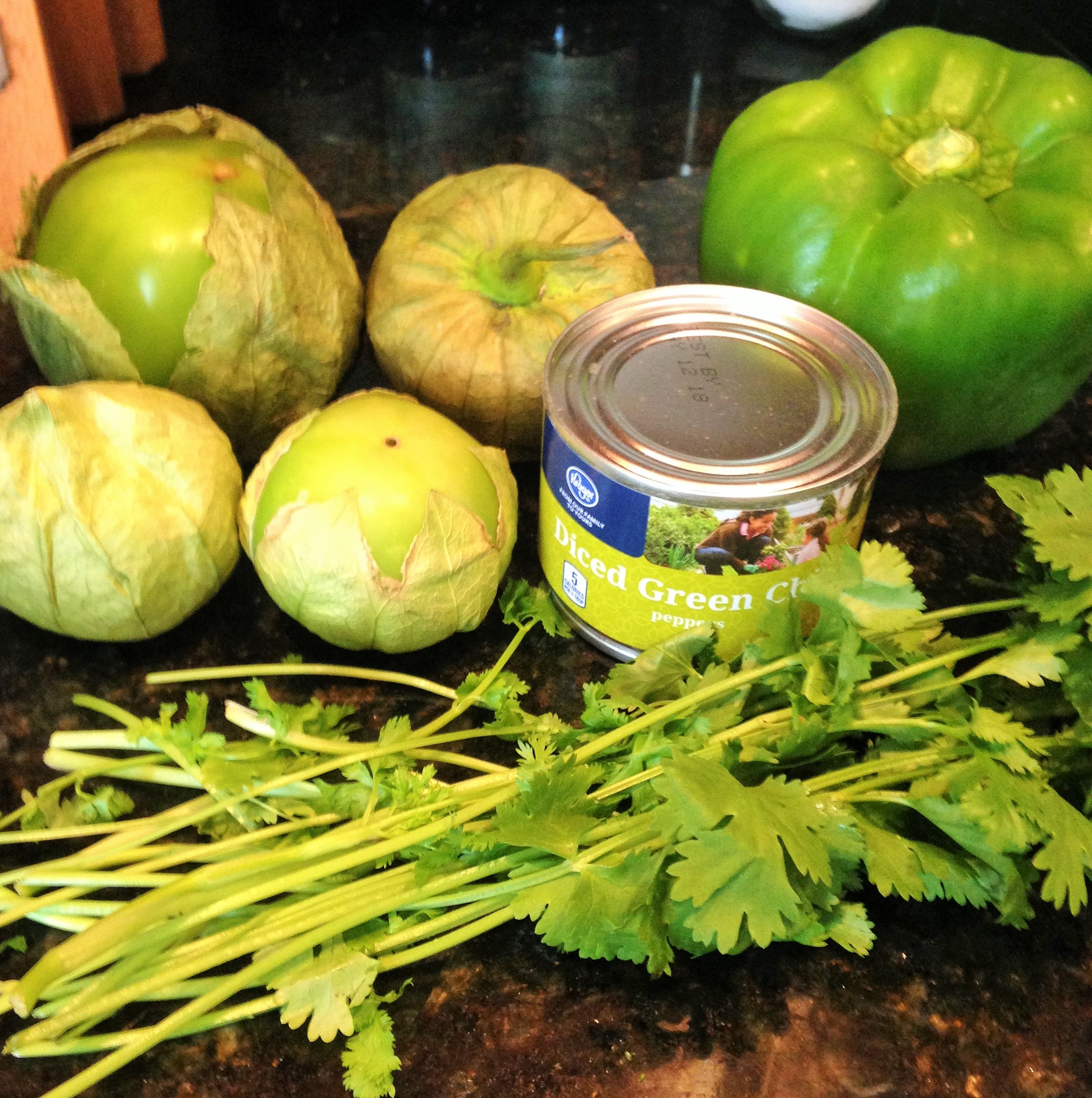 Tomatillos, Garlic Cloves, Green Chile Peppers, Green Bell Pepper, Onion, Ginger, Lemon, Lemon zest, Cilantro, Pineapple, Onion Salt, Black Cracked Pepper