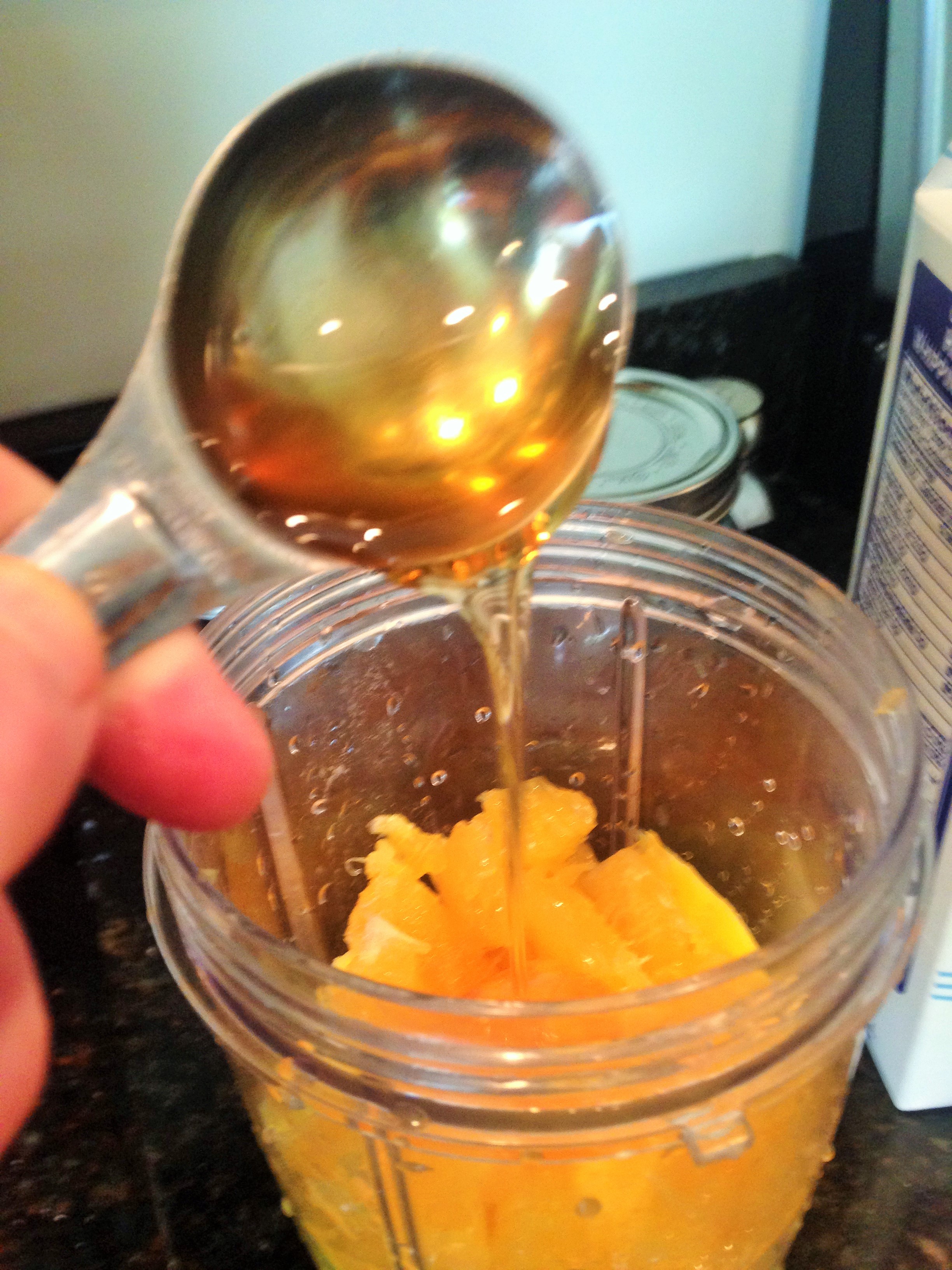 Honey goes into the NutriBullet with mango, orange, orange zest and then pureed.