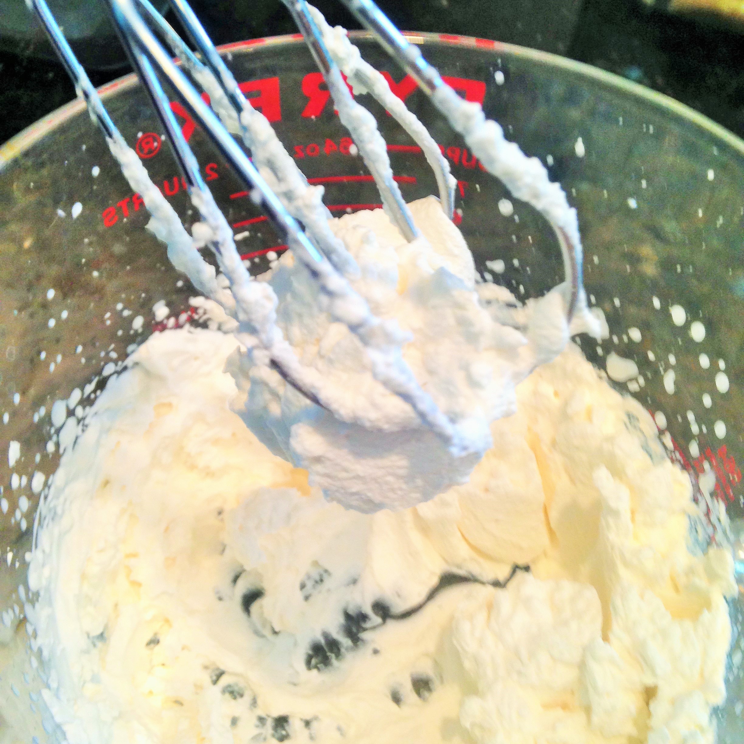 - Beat whipping cream and vanilla flavoring until stiff peaks form